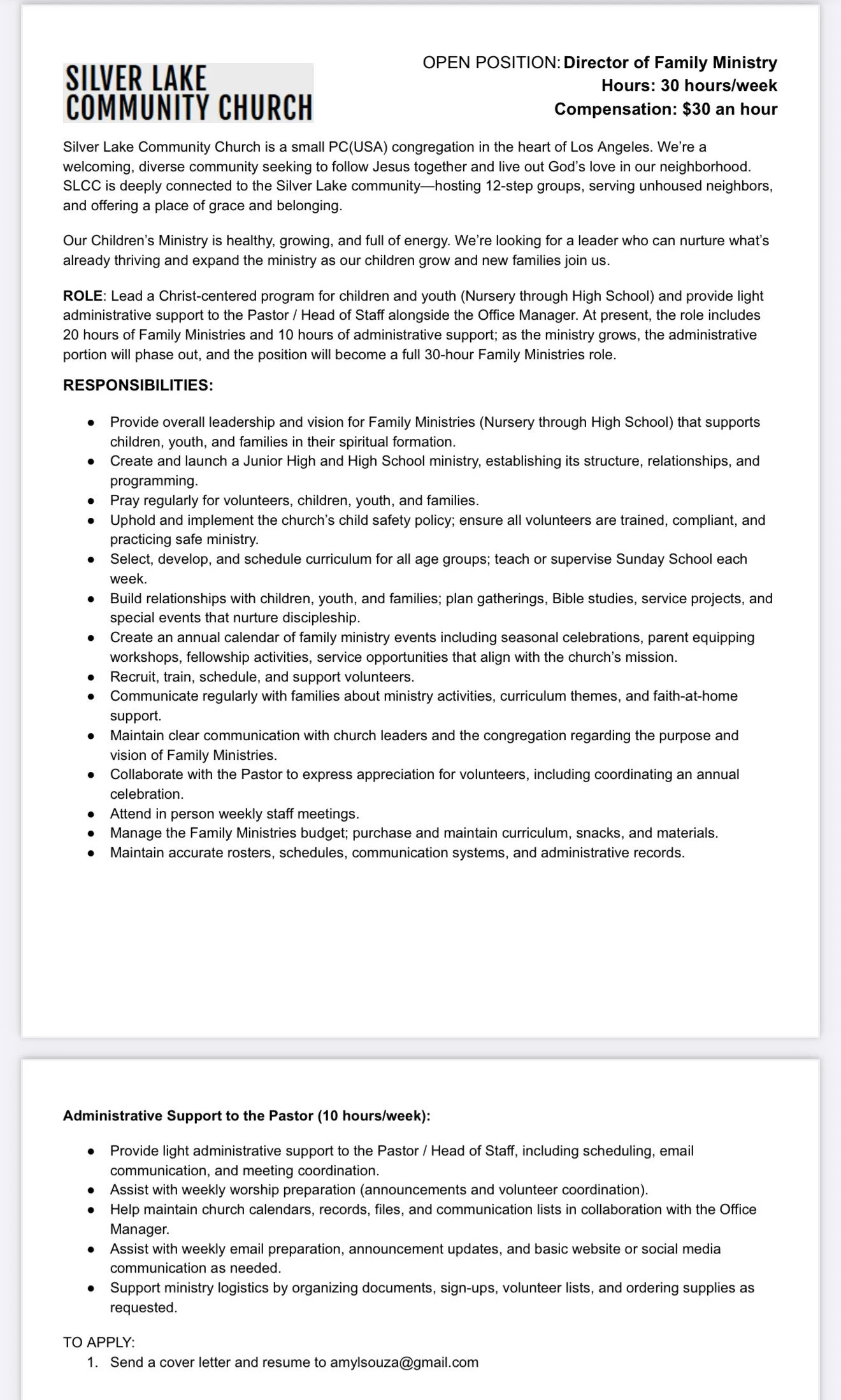 Silverlake Community Church is hiring a Director of Family Ministry! This role is multifunctional and offers the opportunity to be part of an exciting ministry, facilitating and elevating our children’s and youth ministry! The position is approximately 30 hours per week at $30/hourly.